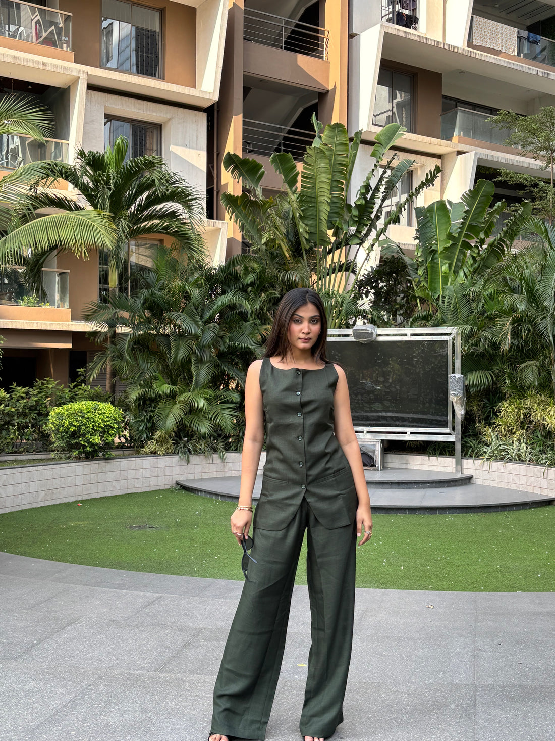 A vest set for the woman rooted in calm confidence. With its earthy olive tone...