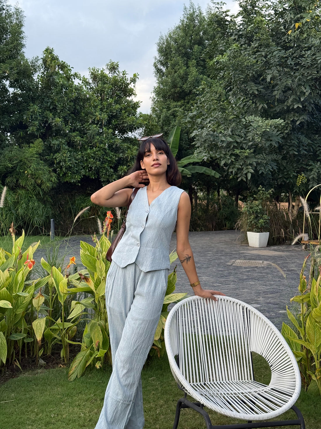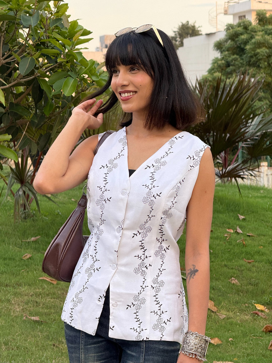 This sleeveless white embroidered Vest Coat set embodies simplicity and grace. Designed for warm summer...
