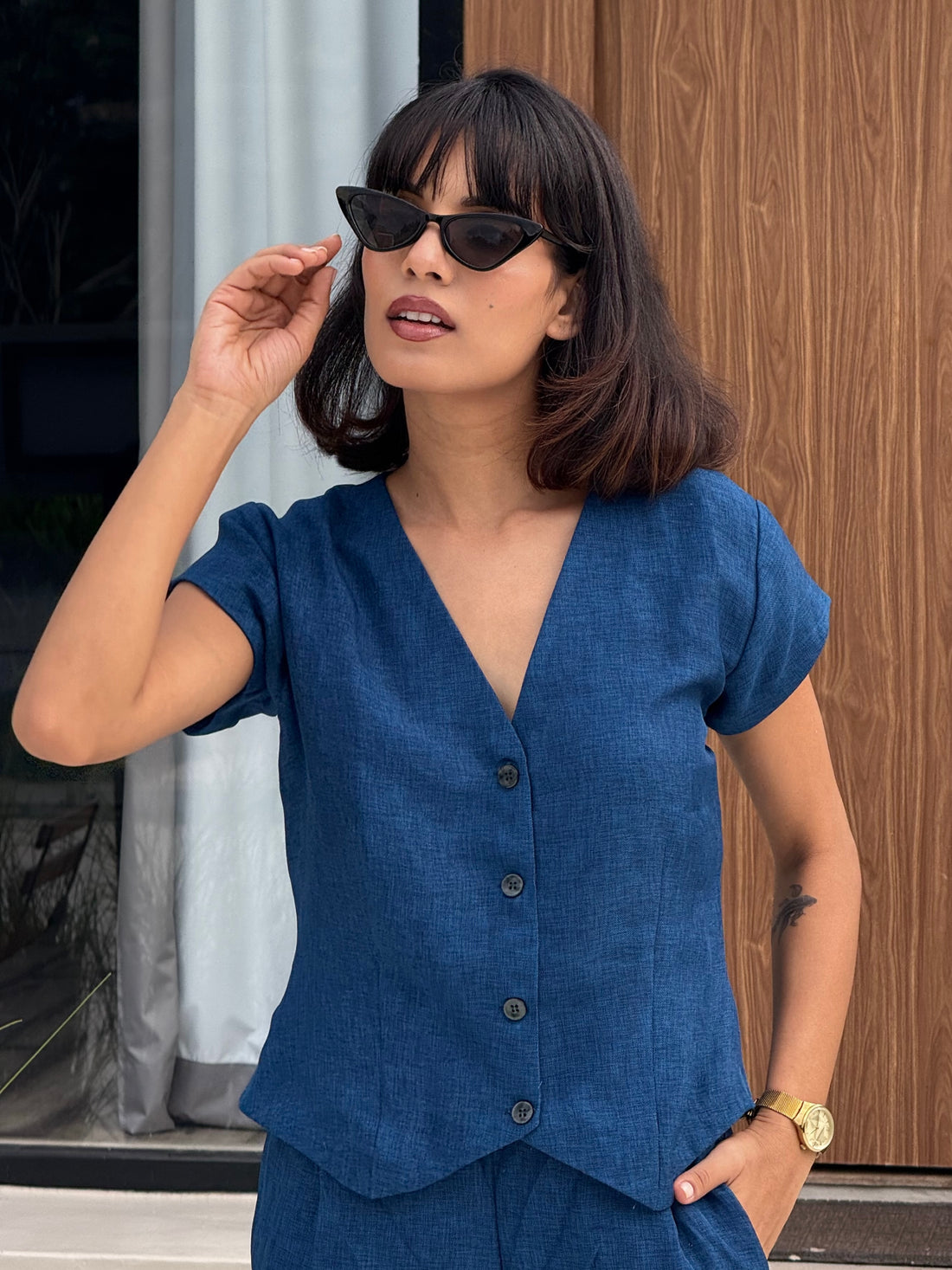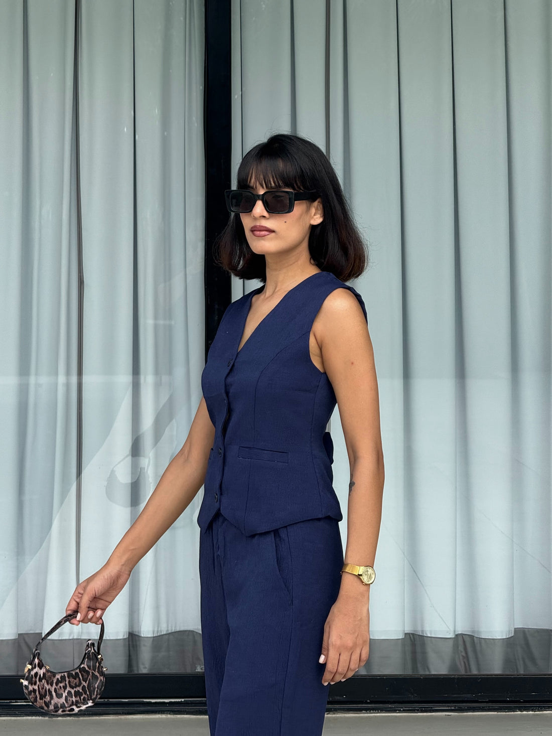 This Vest Coat set blends elegance with a daring touch. Featuring a rich navy hue...