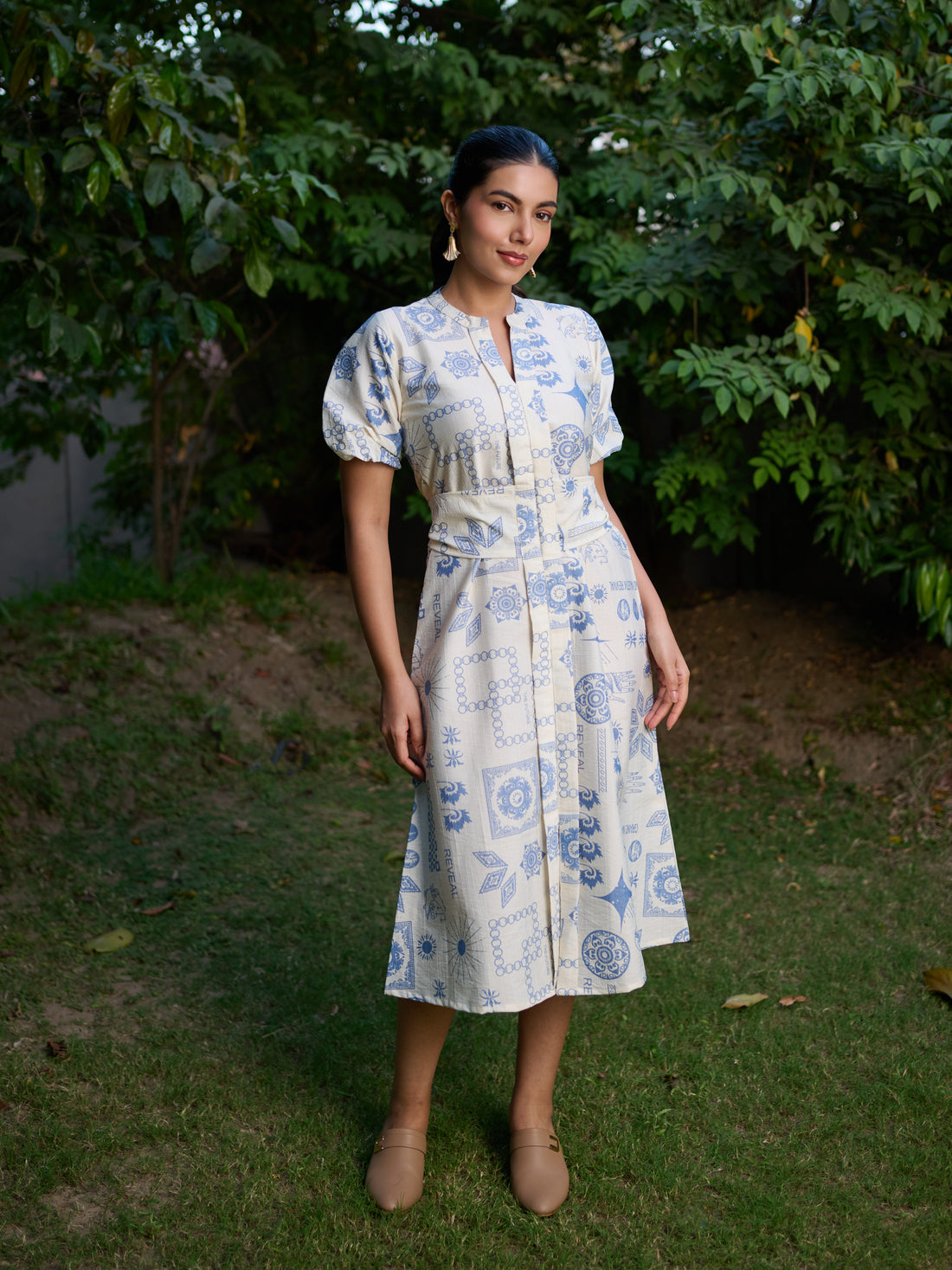 The Perspective Dress White with Blue Geometric Print