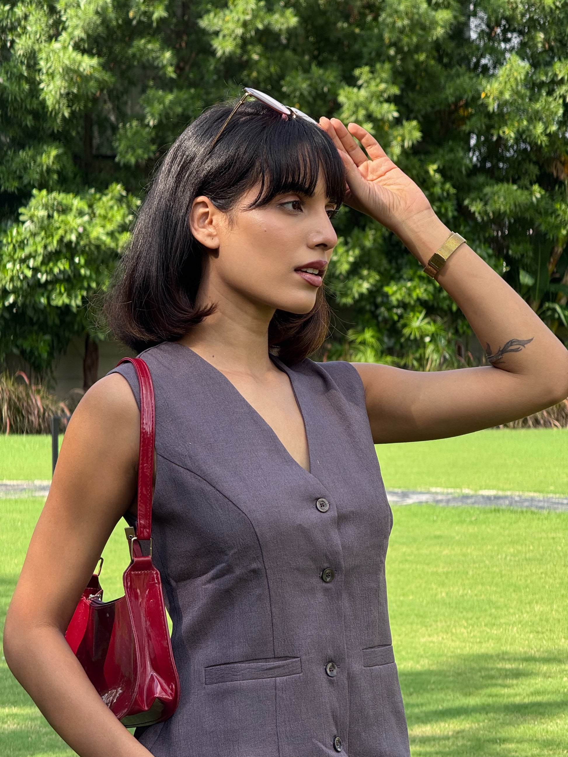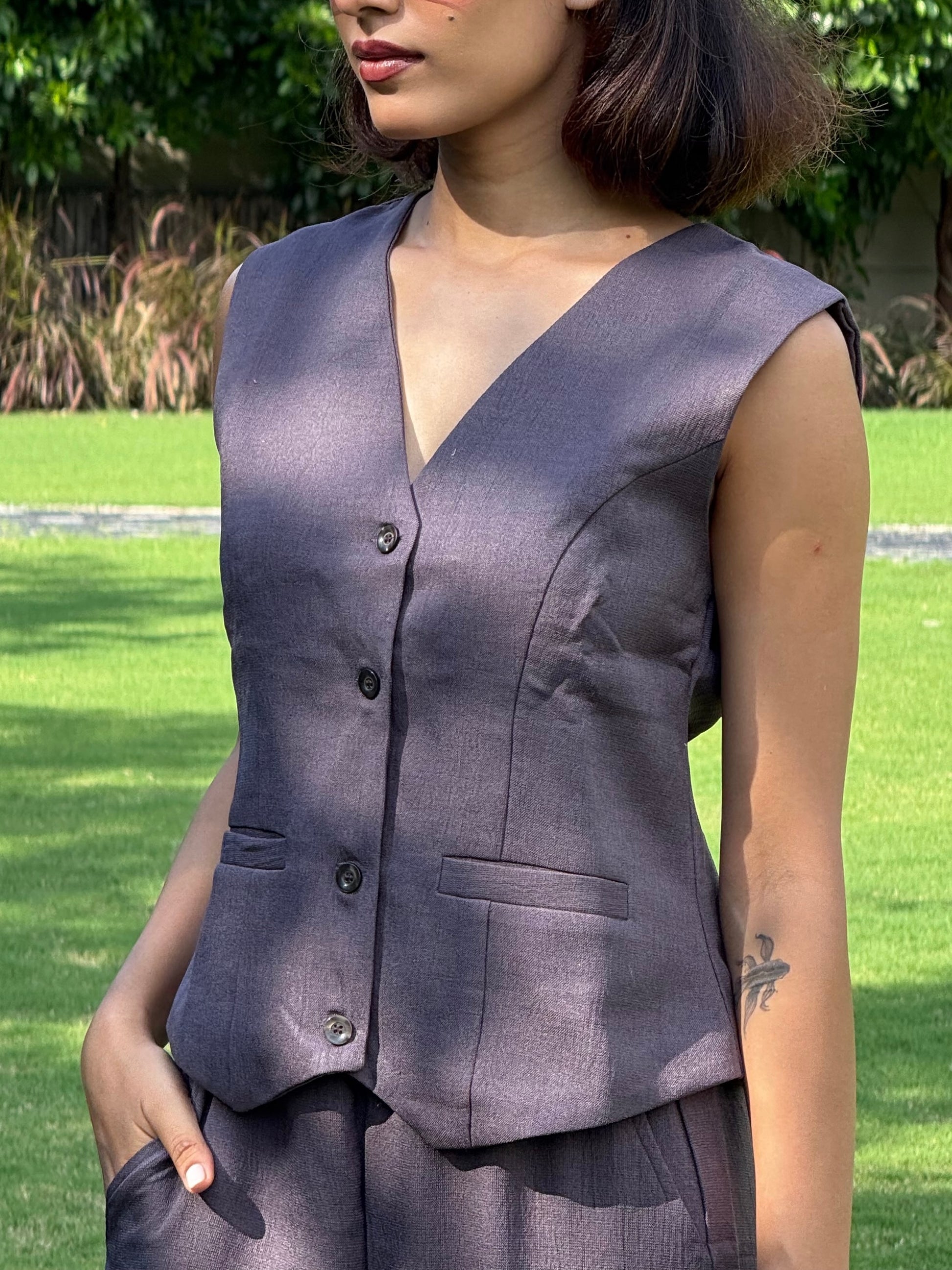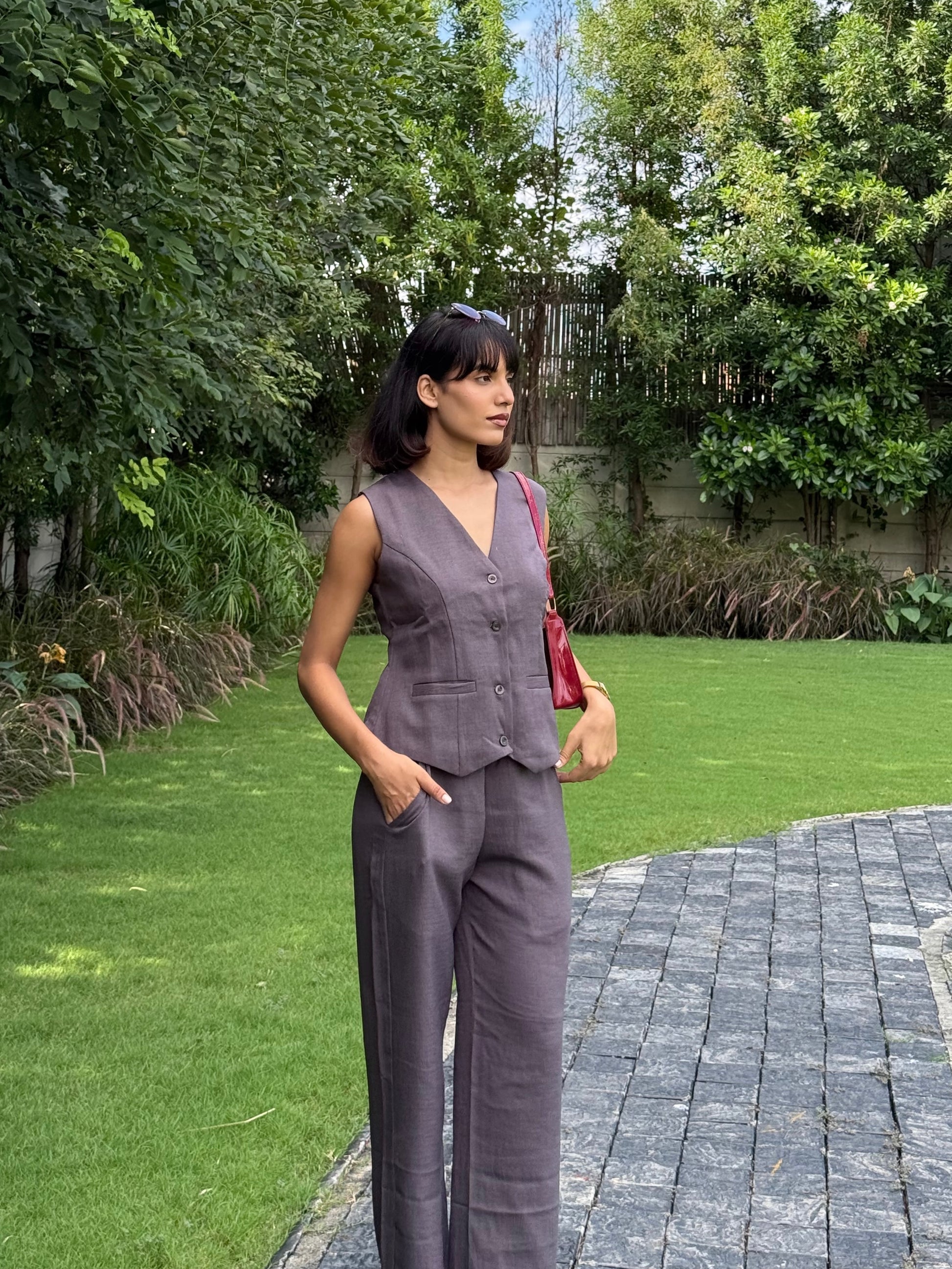 The Charcoal Muse Vest Coat & Trouser Set offers a refined silhouette with its sleeveless V-neck vest and easy-fit trousers. Crafted for women who embrace understated elegance, this ensemble combines comfort and style in a minimalist design. Perfect for transitioning seamlessly from day to evening, it embodies timeless sophistication and quiet confidence.