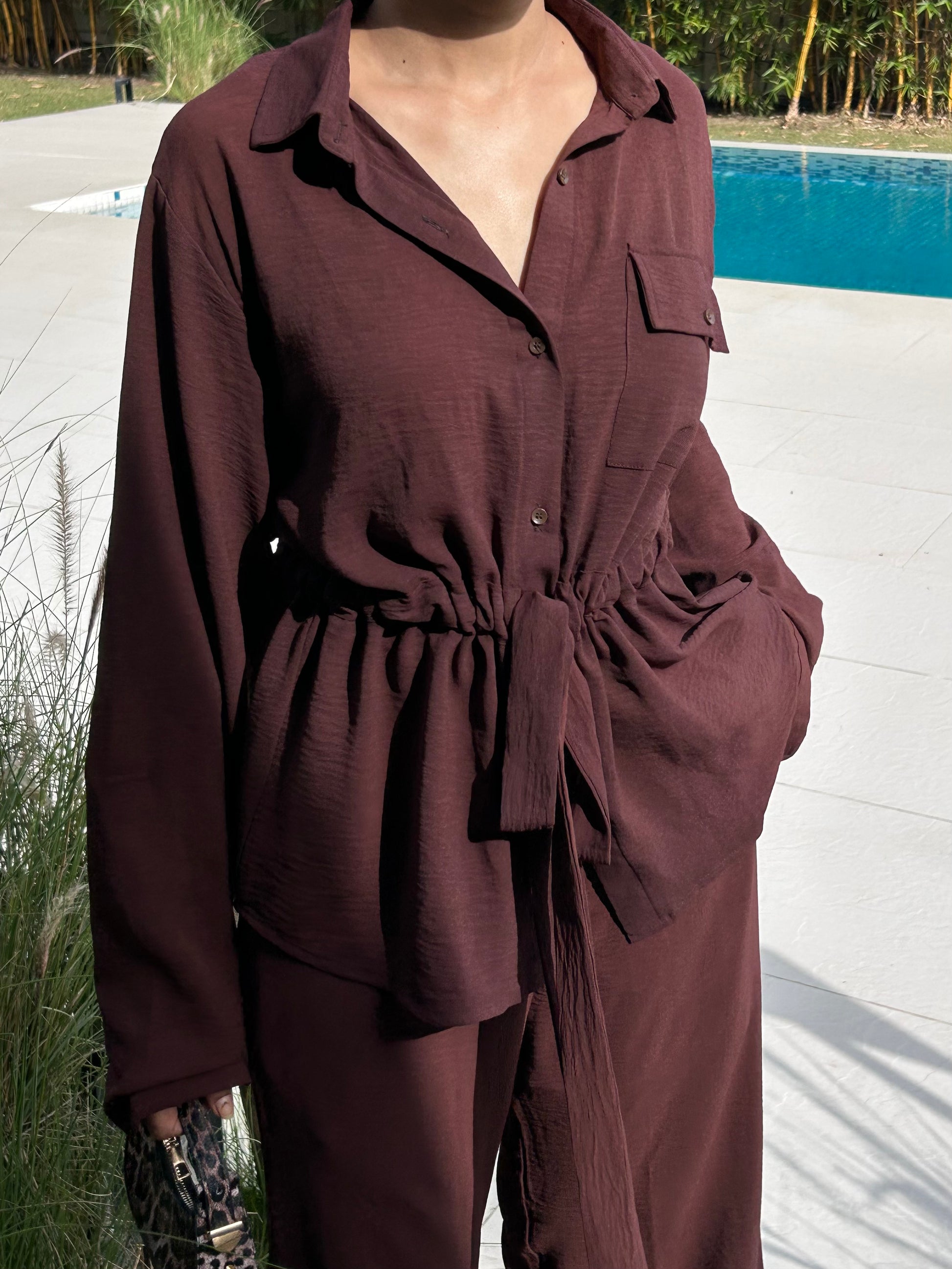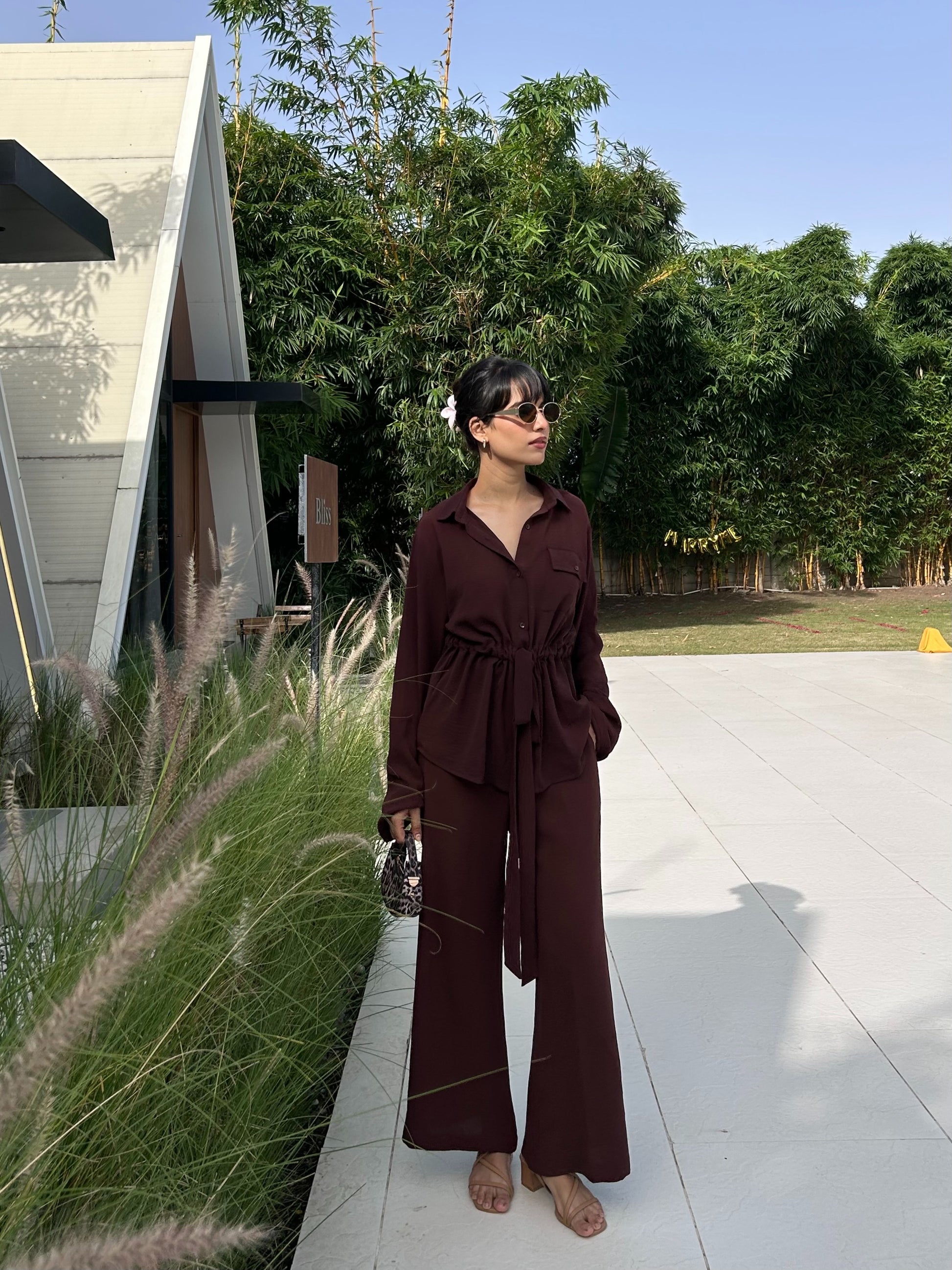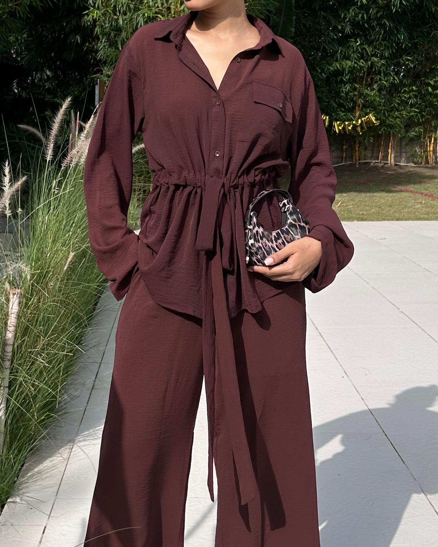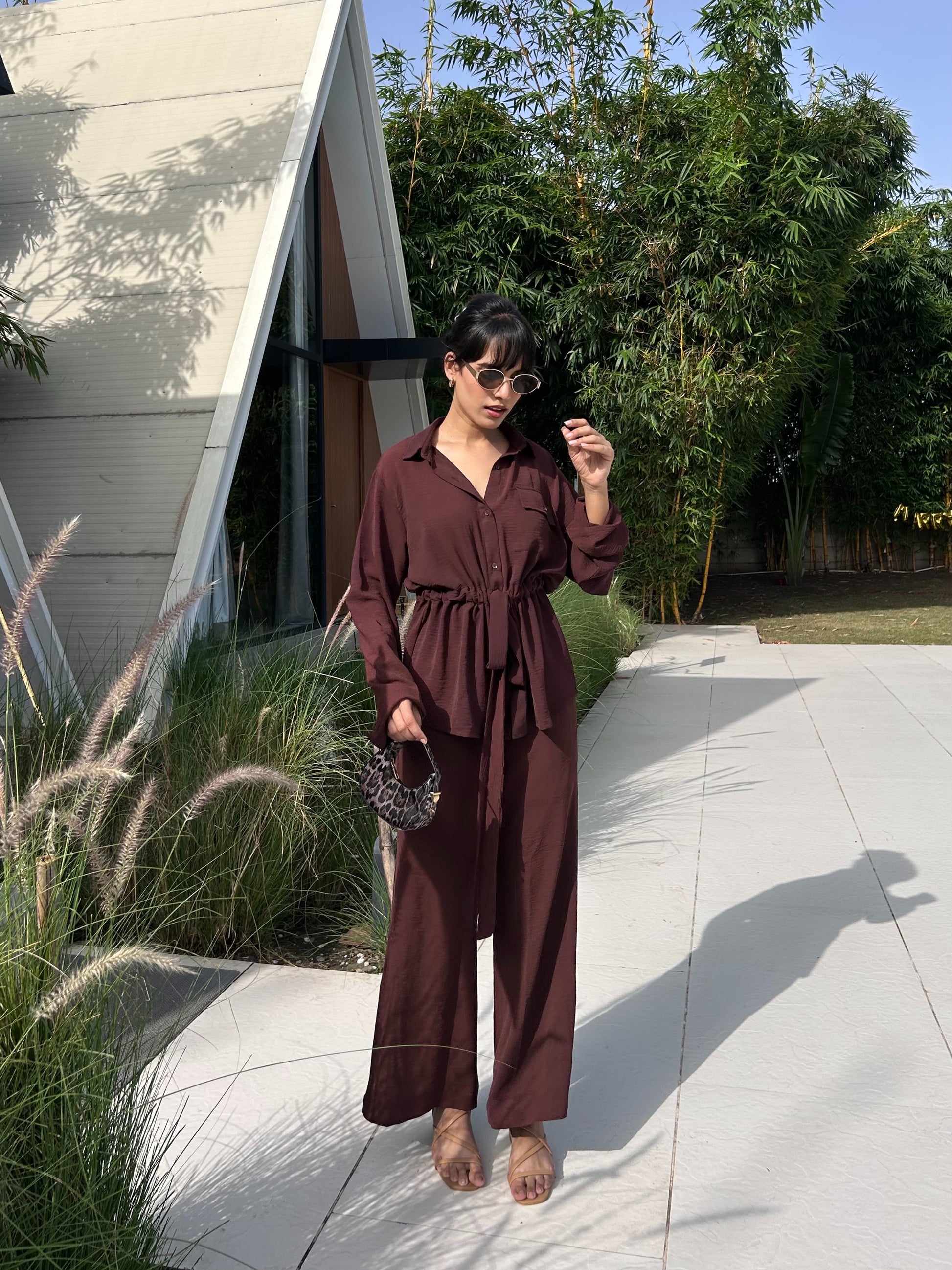 Warm, rich, and endlessly versatile the Cocoa Dusk Coord Set brings relaxed tailoring to everyday wear. Made from lightweight cotton with a natural flow, the shirt features a soft collar, button-down front, and waist tie for a flattering silhouette. The wide-leg bottoms add comfort without compromise. Pair it with flats for day errands or heels for dinner plans this set adapts to your rhythm.