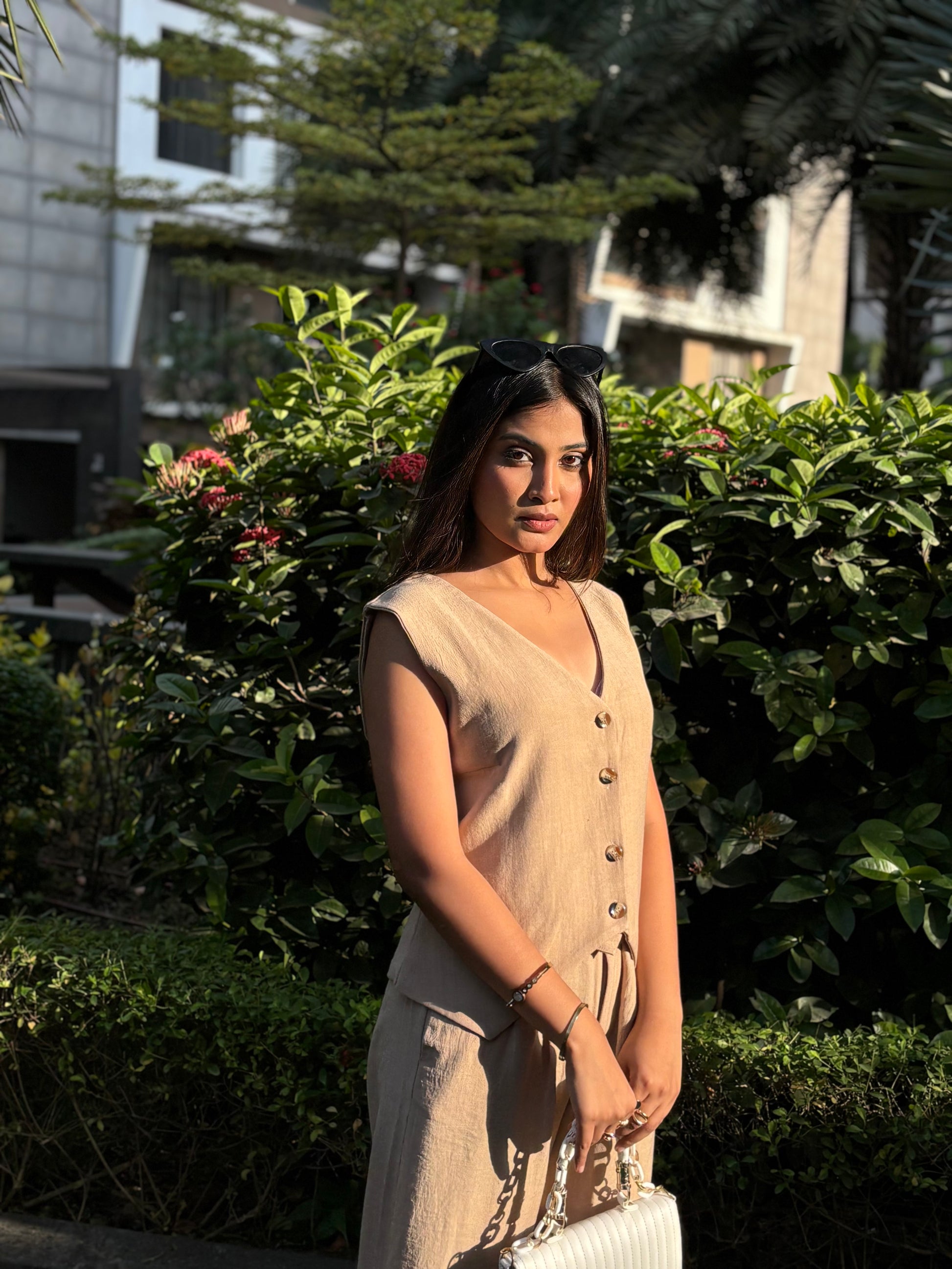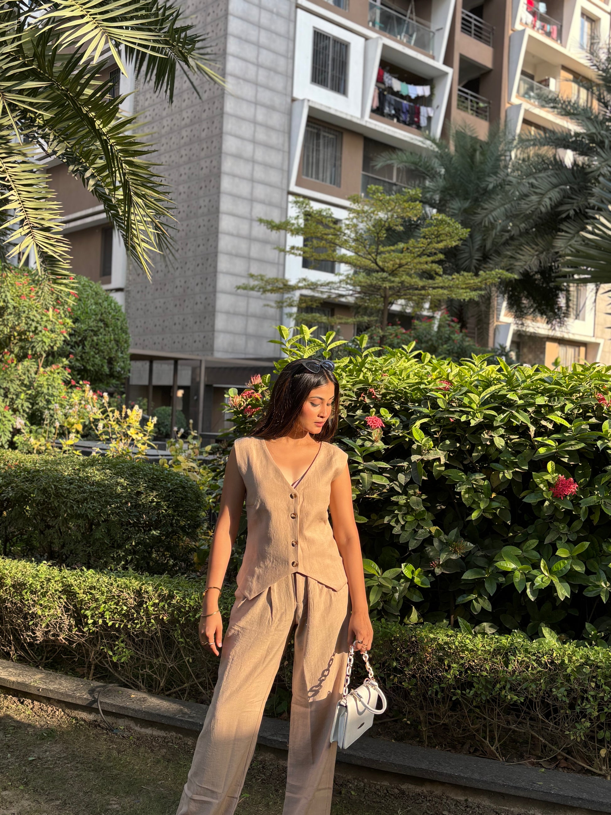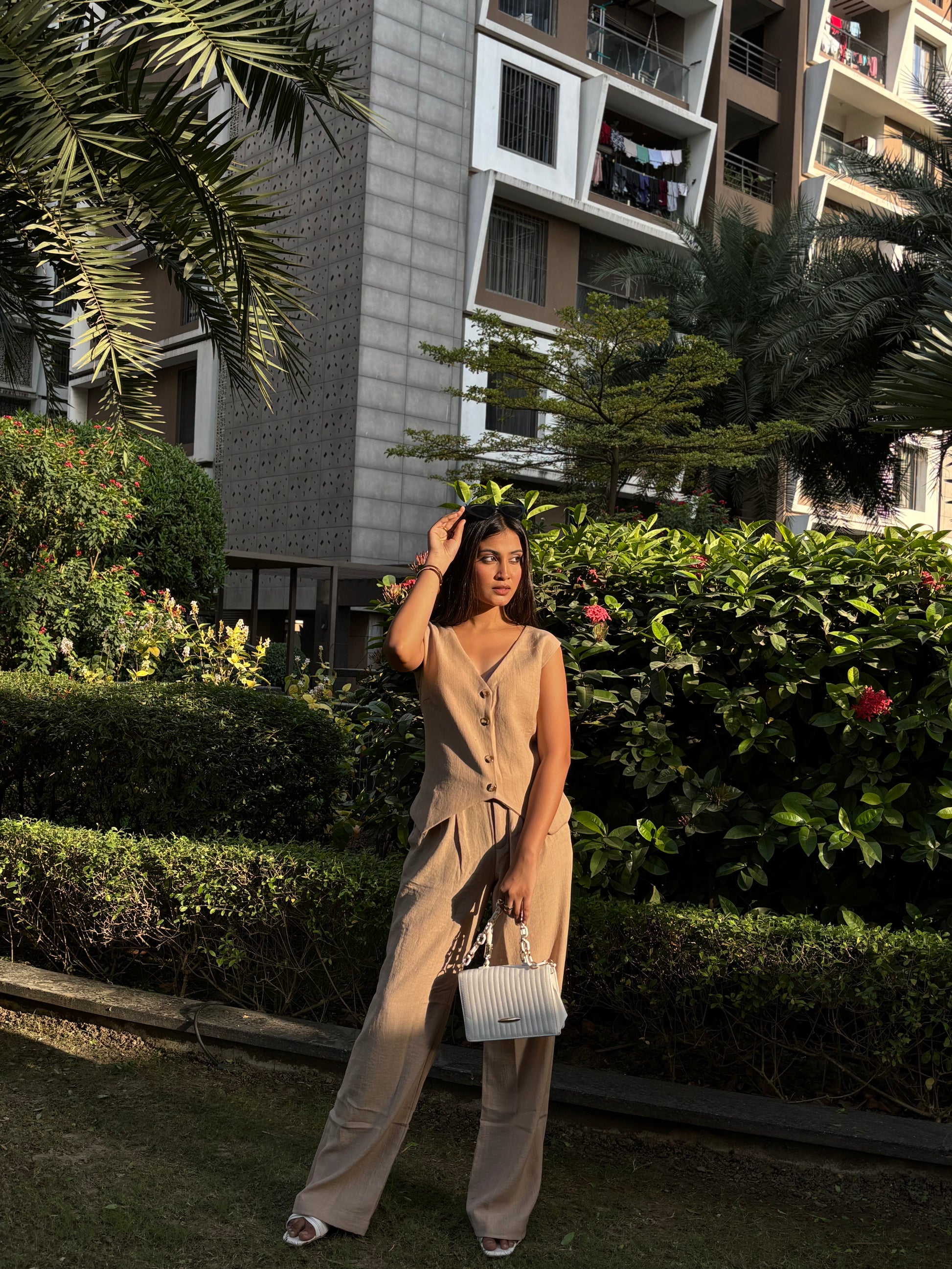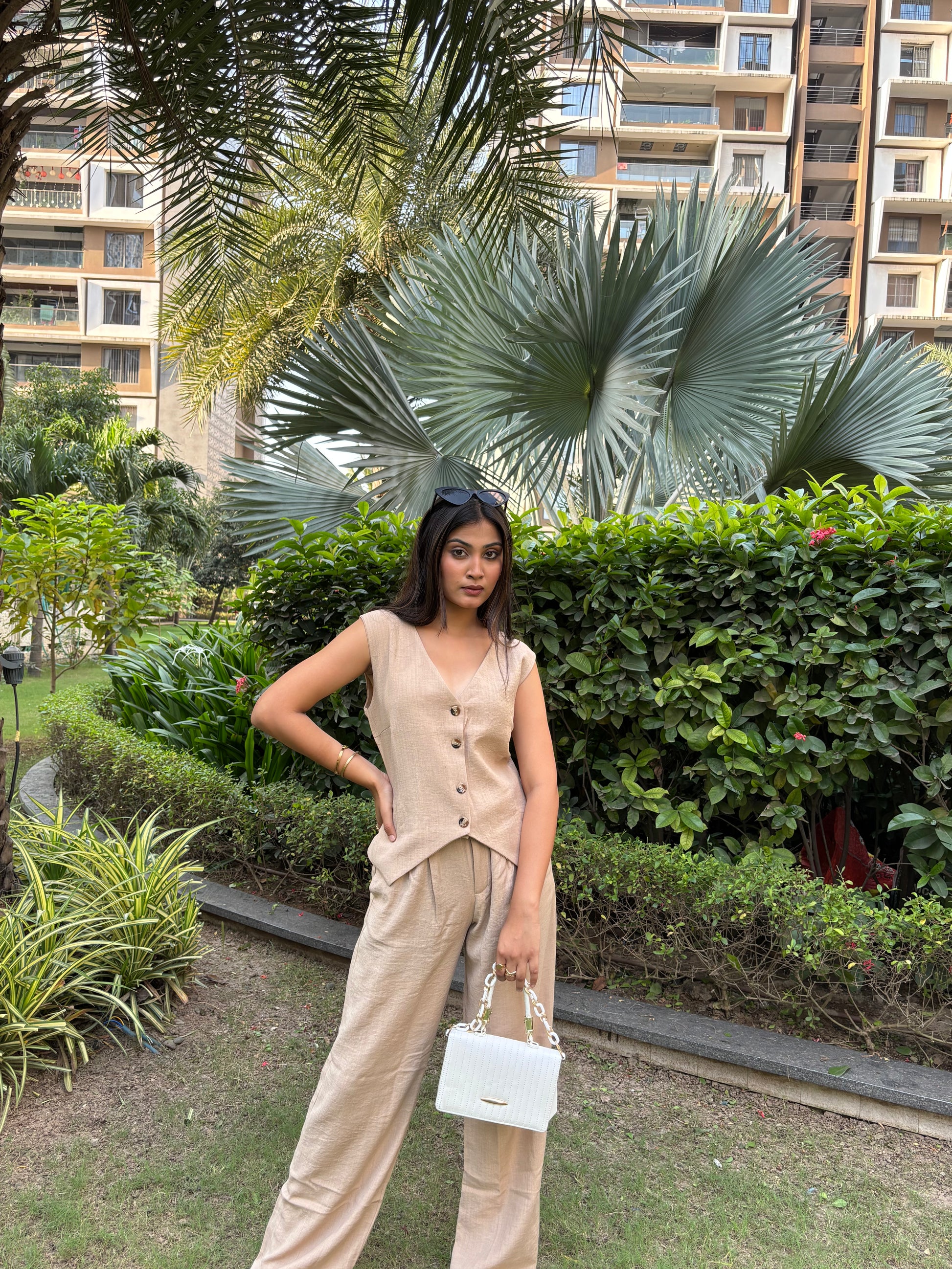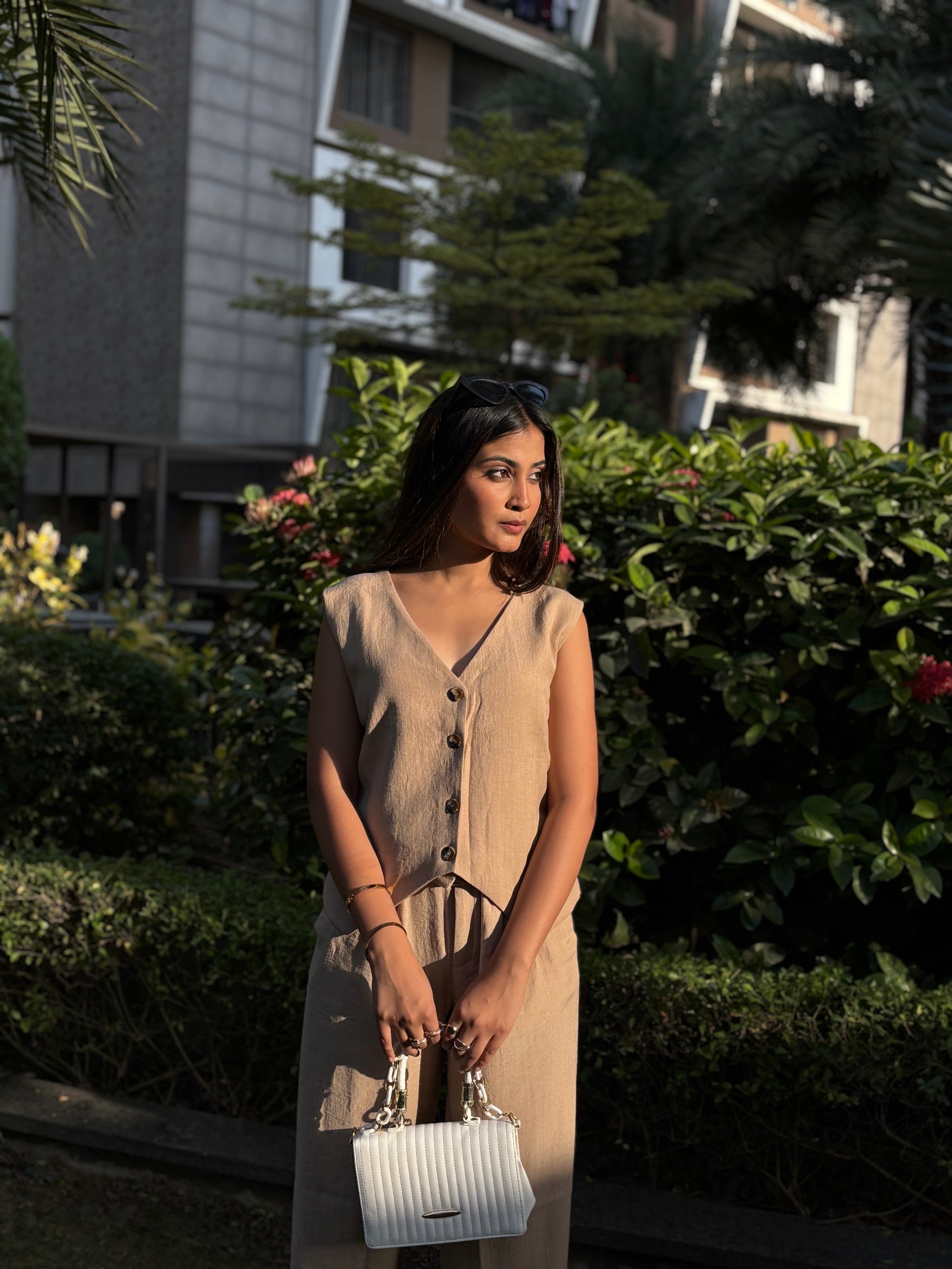 A fresh blend of modern tailoring and playful print, this orange and blue vest coat set brings effortless sophistication. The cotton fabric feels light and breathable, perfect for brunches, creative workdays, or evening get-togethers.