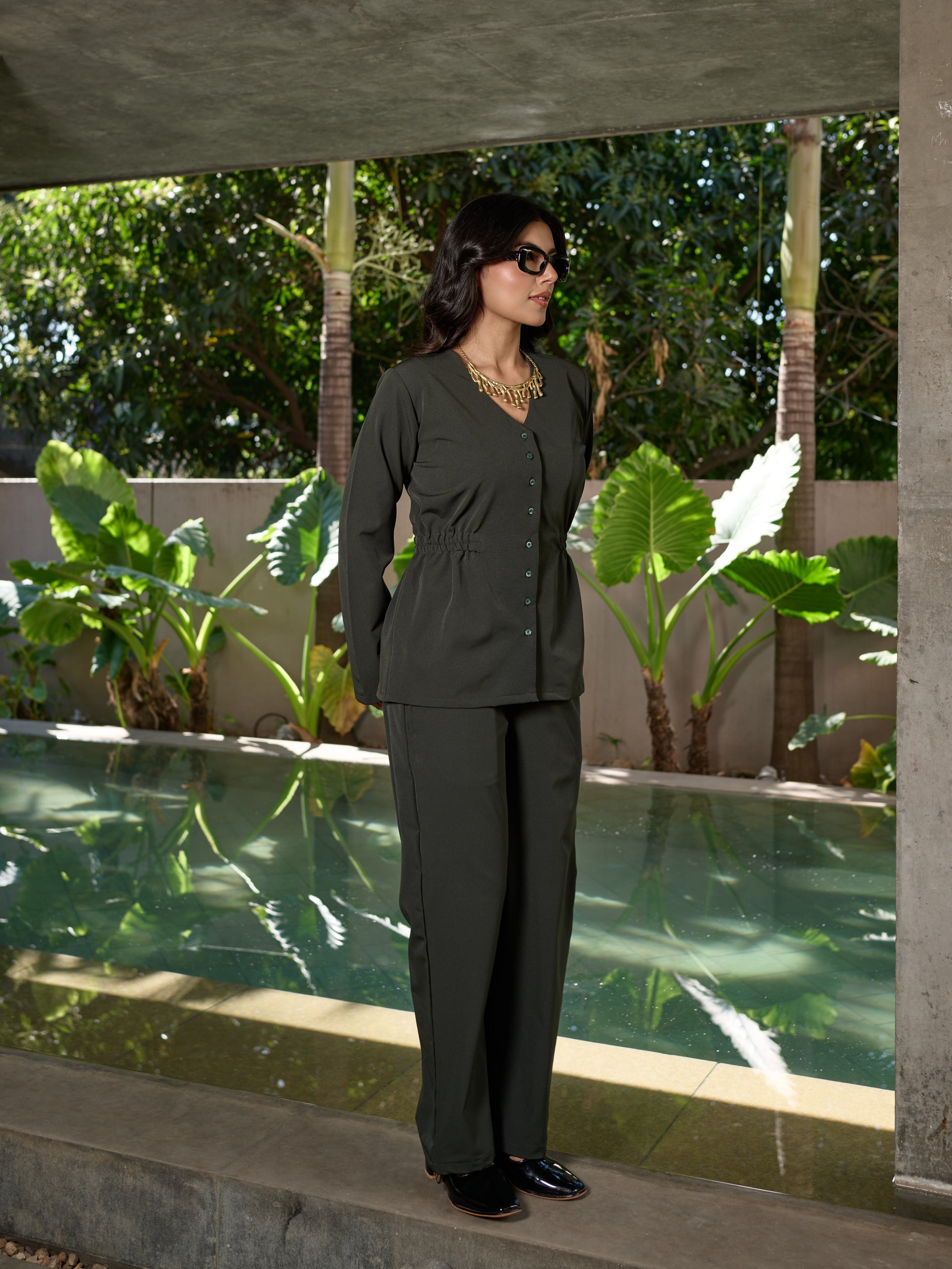 A definitive two-piece set in Charcoal Grey, tailored for the modern minimalist. This version features full-length sleeves and a button-down V-neck front, structured with a gathered, elasticated waist that creates a flattering, defined silhouette. Paired with fluid wide-leg trousers, the ensemble is crafted from premium Khar Khar Imported Crepe, offering a sleek, monochromatic look that commands authority without sacrificing comfort.