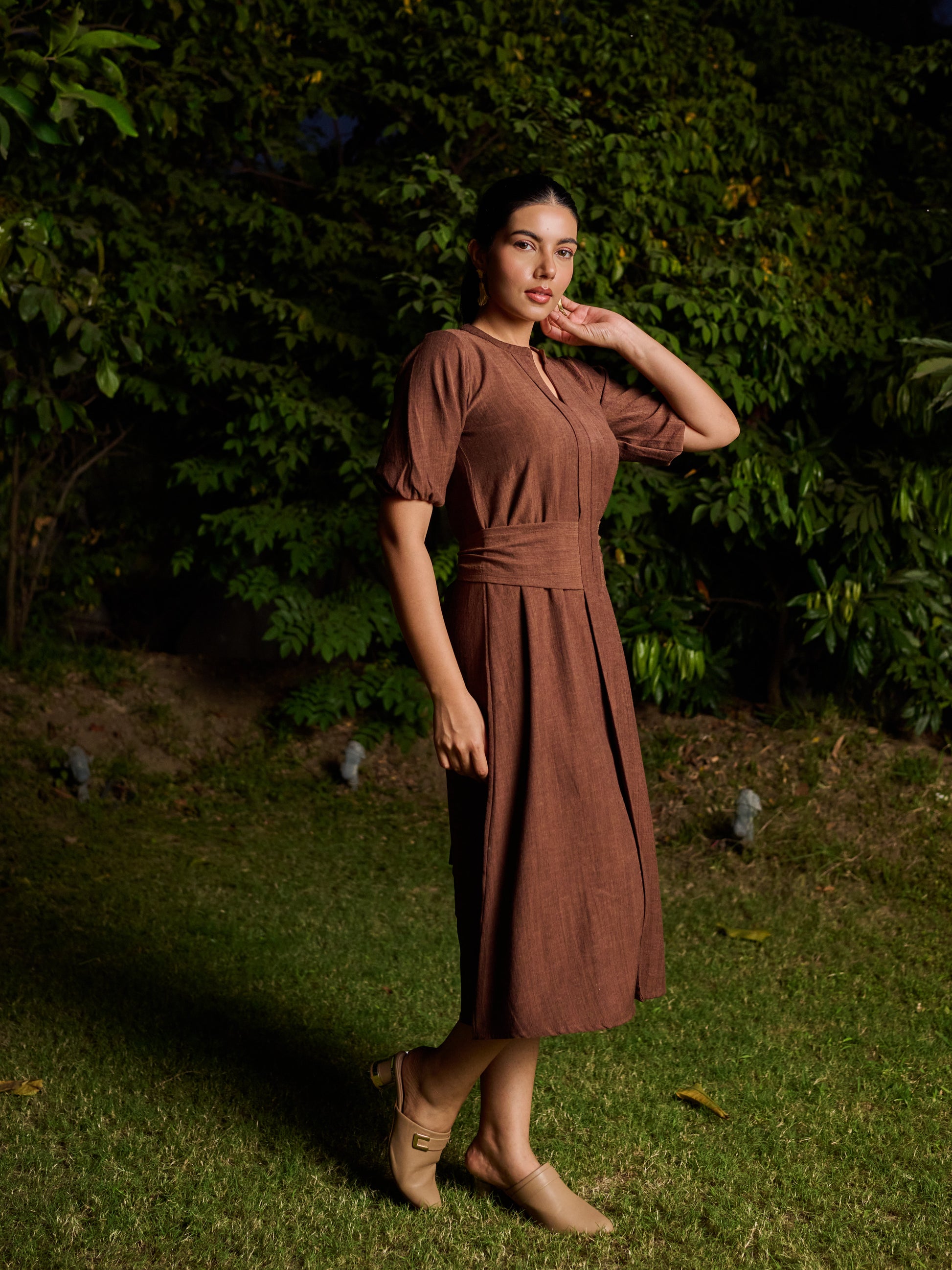 Designed for the modern Indian workwear wardrobe, this dress balances style with modesty. The fit-and-flare silhouette features a wide waistband that flatters curves without clinging, offering a polished look that works from office hours to evening outings.